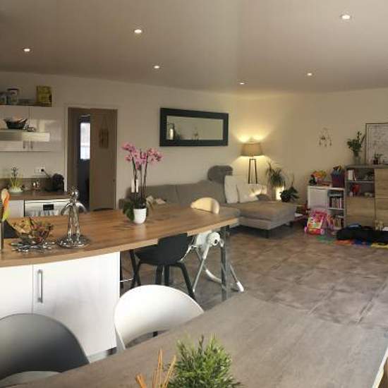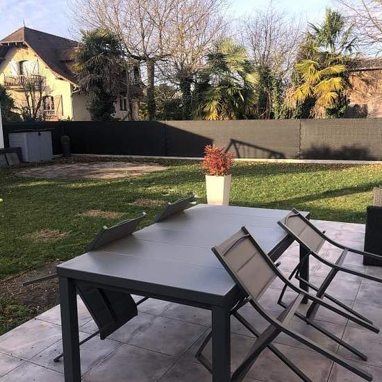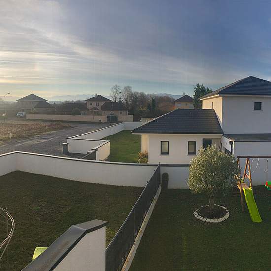 Haut d'IDRON (agglomération Est de PAU), en lotissement au calme, avec Vue PYRENEES, Proche des commerces et commodités (bus idelis ligne 11) Maison mitoyenne d'un côté, BBC 2018 - 5 pièces avec 4 chambres, sur 300m² de terrain env. En rez de chaussée : entrée avec placard, wc avec lave-mains, suite parentale avec salle d'eau privative (douche italienne), ensemble séjour + cuisine US avec climatisation réversible - Garage/buanderie attenant - La cuisine est ouverte et équipée d'un four, hotte aspirante, plaque induction, réfrigérateur/congél...