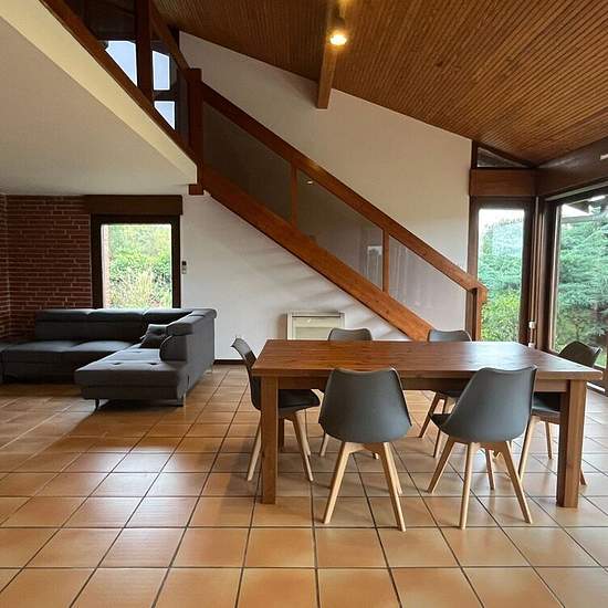 Maison À Louer. Située sur la commune de Montberon. Nous vous proposons à la location cette superbe maison de 160m² sur une parcelle arborée de plus de 3000m² avec grand garage. A l'intérieur, vous profiterez d'une vaste entrée desservant la buanderie, l'accès garage et cave souterraine, le coin nuit ainsi que l'espace de vie. Dans l'espace de vie se tiennent à votre disposition une cuisine fonctionnelle, un agréable, lumineux et spacieux séjour avec cheminée ainsi qu'une vaste mezzanine. Dans le coin nuit sont disponibles 4 chambres...