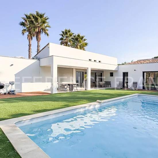 Votre référent immobilier local de MOUGINS (Sébastien MENAND) vous propose. Idéalement située à pied de l'école internationale Bristish Mougins School, de l'étang de Fontmerle, de la forêt de la Valmasque et d'une boulangerie. Superbe villa contemporaine meublée de plain-pied de 180 m² approx (4 chambres) sur 1 000 m2 approx de terrain paysagé à l’abris des regards avec belle piscine. Climatisation. Entrée desservant une spacieuse salle de réception cathédrale avec salon TV et salle à manger et cuisine américaine avec îlot centrale. 4 chambr...