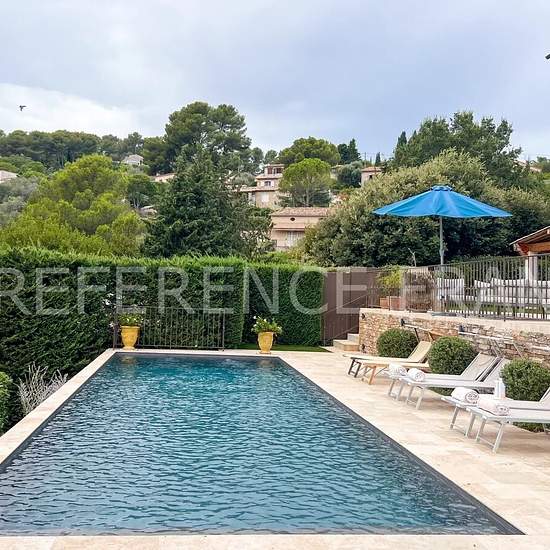 Votre référent immobilier local de MOUGINS (Sébastien MENAND) vous propose. Située à proximité des commerces et du vieux village de Mougins. Charmante villa provençale entièrement rénovée d'environ 200 m2, édifiée sur 1 200 m2 de terrain paysagé bénéficiant d'une jolie vue mer avec piscine chauffée, barbecue et nombreux espaces de réceptions. Entièrement climatisée, elle propose : EN REZ DE JARDIN : - Entrée - Toilette invité - Salon TV - Salle à manger - Cuisine ouverte entièrement équipée À L'ÉTAGE : - Buanderie avec lave-linge et sèche-li...