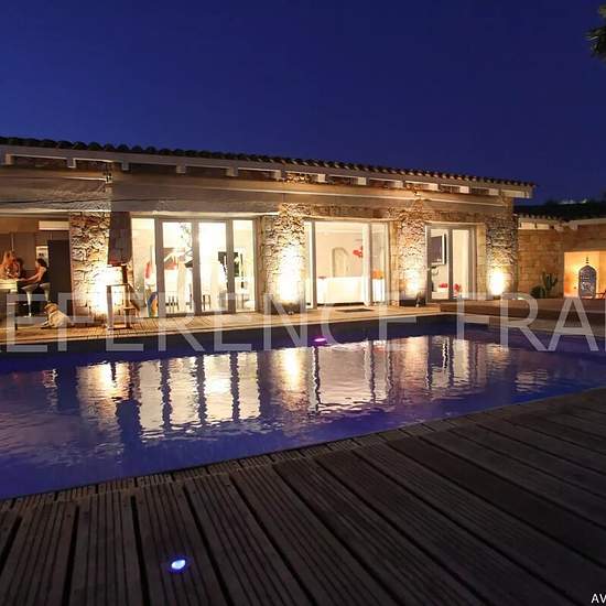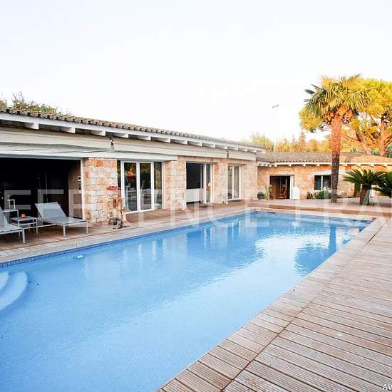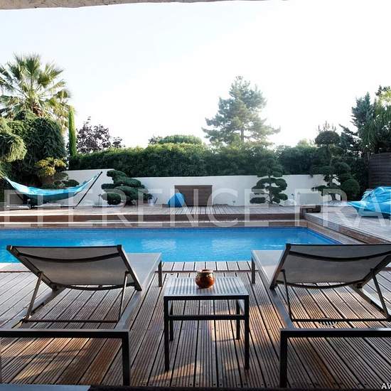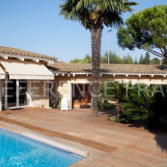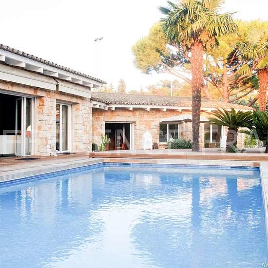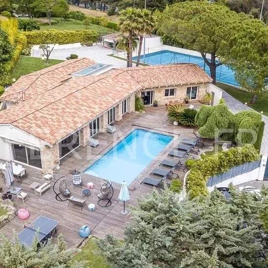 Votre référent immobilier local de Mougins (Sébastien MENAND) vous propose. Location à l'année. Petit domaine fermé à proximité immédiate du vieux village de Mougins et de ses restaurants. Sur un terrain plat de 3600 m², villa en pierre de plain-pied de 250 m2 habitables approx (350 m² au total) avec des prestations modernes et confortables. Jardin de 3600 m² avec court de tennis. Entièrement climatisée. Grand salon / salle à manger, cuisine américaine entièrement équipée, 3 chambres dont une master en suite, salle de sport avec hammam et ja...