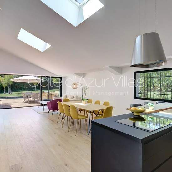 DISPONIBLE MI AOUT 2025 JUSQUE JUIN 2026 Belle villa contemporaine de 185 m² au calme avec localisation idéale pour les écoles internationales de Mougins et Valbonne. Rez-de-chaussée : Grand salon ouvert sur la cuisine entièrement équipée et salle à manger, buanderie, une chambre en suite avec salle d'eau, une chambre parentale ensuite avec salle d'eau et dressing. Toilettes invités. Premier étage : Deux chambres ensuite avec chacune avec sa salle d'eau et WC. Prestations supplémentaires : Piscine, alarme, internet fibre, volets roulants éle...