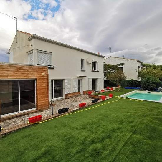NARBONNE QUARTIER RECHERCHE : Maison de 174m2 sur 445m2 de terrain clos. Libre de 4 faces r+1. Composé en rdc d'un hall d'entrée avec placard, suite parentale de 24m2 avec son dressing et salle d'eau (la salle d'eau dispose d'une douche à l'italienne et une baignoire), séjour spacieux et lumineux de 60m2 exposé sud donnant accès à la partie extérieur avec terrasse, piscine et jardin. A l'étage vous pourrez apprécier les 4 chambres dont chacune dispose d'une mezzanine supplémentaire offrant donc de beaux volumes, deux salles d'eau, wc indépen...