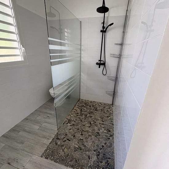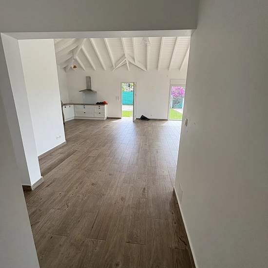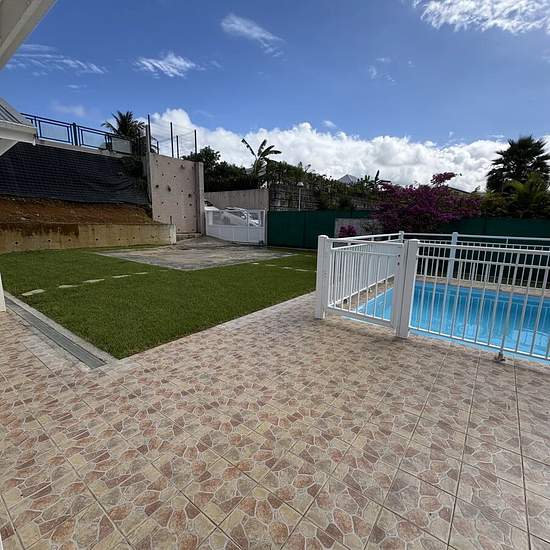 Belle Villa T5, récente situé dans un lotissement qualitatif et calme, vue dégagée, à Morne Bourg, Petit-Bourg comprenant: 1 grand séjour ouvert sur une cuisine aménagée et semi-équipée d'une plaque de cuisson et d'une hotte, 1 cellier, 1 dégagement, 1 wc indépendant, 1 chambre parentale climatisée avec dressing et sa salle d'eau avec wc attenante, 3 chambres climatisées avec placard, 1 salle d'eau, 1 terrasse, 1 piscine au sel avec garde corps sur terrain de 808m2 clôturé avec portail électrique et portillon. Disponible de suite Loyer 2 300...