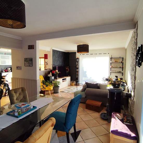 PLOUDANIEL Maison de 137 m². Située au centre bourg, cette spacieuse maison comprend: Rez-de-chaussée: Entrée, cuisine aménagée équipée, salon séjour avec poêle à bois, une chambre, dégagement, bureau, buanderie, chaufferie, wc. Etage: trois chambres, salles de bains, wc Jardin clos Disponible le: 07/02/2026