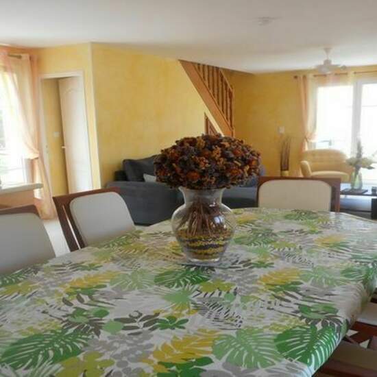 Maison comprenant: séjour (TV) /cuisine équipée (lave-vaisselle, réfrigérateur-freezer, micro-ondes, four, 4 plaques céramique), WC. 3 chambres à l'étage lits de 140, salle-d'eau, WC. Studio/mezzanine attenant lit 140 sur mezzanine+ lit bébé, séjour (TV) /cuisine (lave-linge), salle-d'eau, WC. Terrasse, jardin. 800m plage de Nauzan, 850m à pied centre de Vaux, lac, parc. Surfaces et distances données à titre informatif et non contractuel. Petits chiens acceptés. Juin et septembre: 750E par semaine Du 1 au 8/07: 1063E la semaine Du 8 au 15/07...