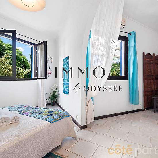 Dossier n° 0241 L'IMMO by Odyssée vous propose à la location cette villa d'architecte entièrement meublée, de type T5, d'une superficie d'environ 209 m², située sur le secteur de Condé Concession, à la Ravine des Cabris. Le logement se compose, au rez-de-chaussée, d'une entrée, d'un WC indépendant, d'une cuisine aménagée et équipée ouverte sur un double séjour lumineux, d'une suite parentale avec salle de bains et WC, d'une buanderie ainsi que d'une varangue. A l'étage, vous trouverez trois chambres, dont deux avec accès à une terrasse, une ...