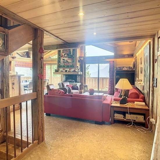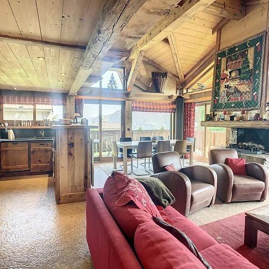 Dans une résidence, petit chalet (voir photo) située à 500m du centre de Combloux ; 6 pièces d’environ 120m2 composé de : Une entrée, grand séjour séjour avec cheminée (Bio-Etannol) donnant sur un balcon-terrasse d’angle avec cuisine américaine équipée (plaques, four, frigo, LV, micro-onde…), d’une salle de bain wc ; A l’étage (sous-pente) : 1 chambre avec un lit de 80cm et d’une salle TV avec matelas ; En rez de jardin : 2 chambres avec 2 lits de 90cm chacune, 1 chambre avec 1 lit 90cm, 1 salle de douche wc, et 1 suite parentale avec lit 16...