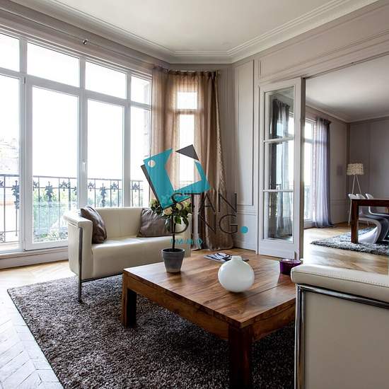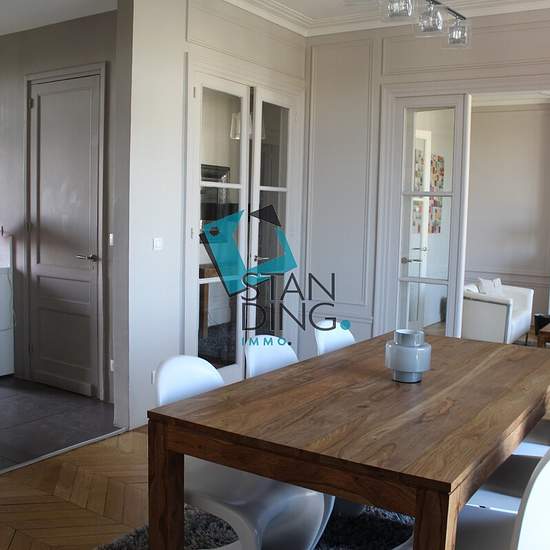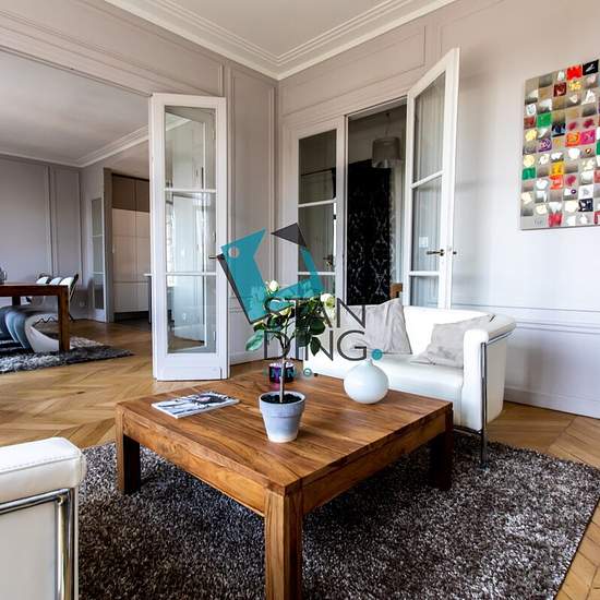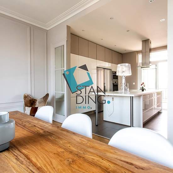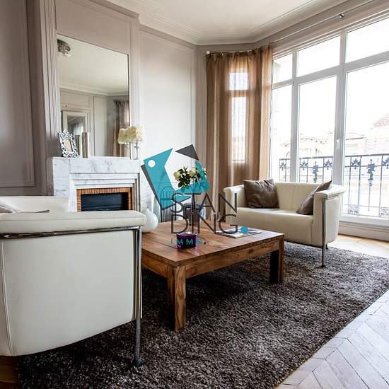 A propos de ce bien Appartement traversant de 150 m2 situé au 6ème et dernier étage d'un immeuble haussmannien entièrement rénové : Séjour (19 m2) avec cheminée feu de bois, salle à manger (22 m2), balcon filant, cuisine US équipée (15 m2) avec ilot central (réfrigérateur, congélateur, lave-vaisselle, plaques induction, hotte, four et four micro-ondes, TV LED murale) donnant sur terrasse orientée sud-ouest, 3 chambres (18, 16 et 9 m2) dont 2 avec lit de 160, salle de bains avec double douche italienne, 2 WC, dressing aménagé de 8 m de long ...