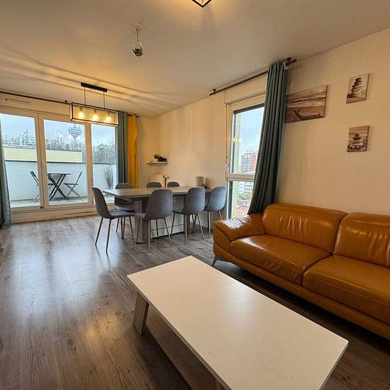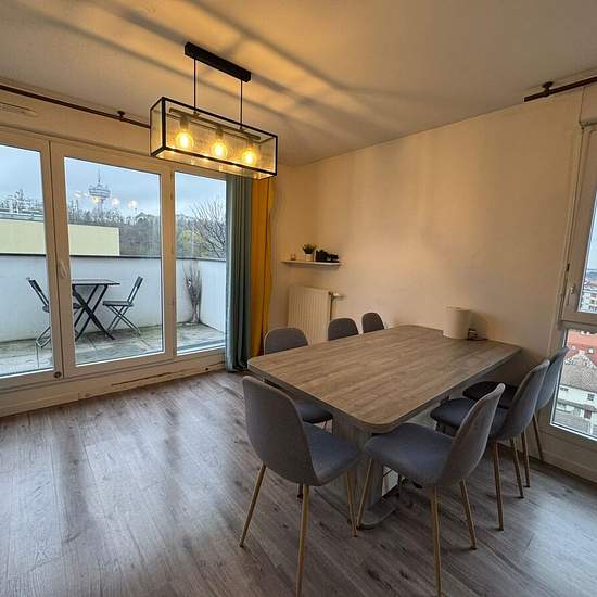 À louer : charmant appartement meublé de 97 m², situé au 9ᵉ étage d’un immeuble récent et sécurisé avec ascenseur au Chemin des Groux, 93230 Romainville. Ce logement cosy conviendra parfaitement à ceux qui recherchent un cadre de vie agréable, pratique et très bien desservi. L’appartement offre une pièce de vie lumineuse et conviviale, aménagée avec une table pour sept personnes et un meuble TV., un grand canapé d'angle en cuir, une table basse, et une télévision. Le séjour s’ouvre sur une beau balcon de 7.2 m² orientée plein Est, idéale pou...