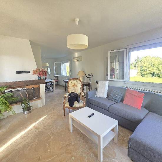 Dans un secteur résidentiel calme et excentré du village, découvrez cette villa année 1980 offrant 123.32 m² habitables. Au niveau supérieur, un hall d'entrée avec placard, un salon / salle à manger lumineux avec cheminée et accès terrasse équipée d'un store banne, une cuisine séparée meublée et équipée (plaque de cuisson gaz 4 feux, hotte, four) donnant également sur Terrasse, ainsi qu'un dégagement desservant deux chambres avec placards dont 1 Parentale avec Salle de bains / wc, un bureau, une petite salle d'eau et un WC indépendant avec l...