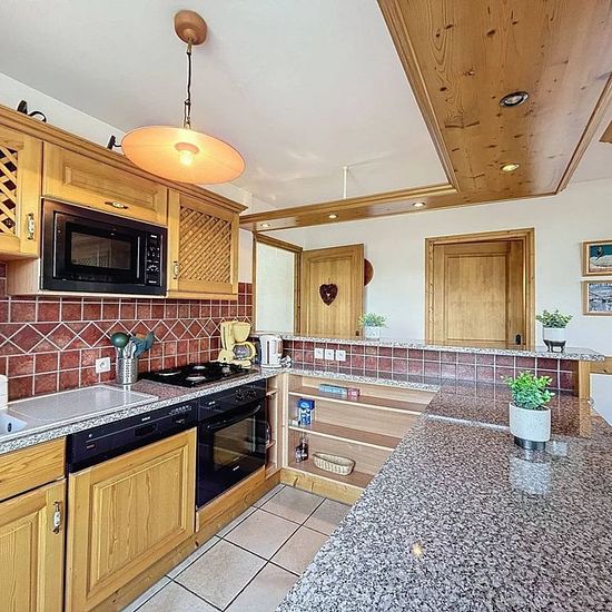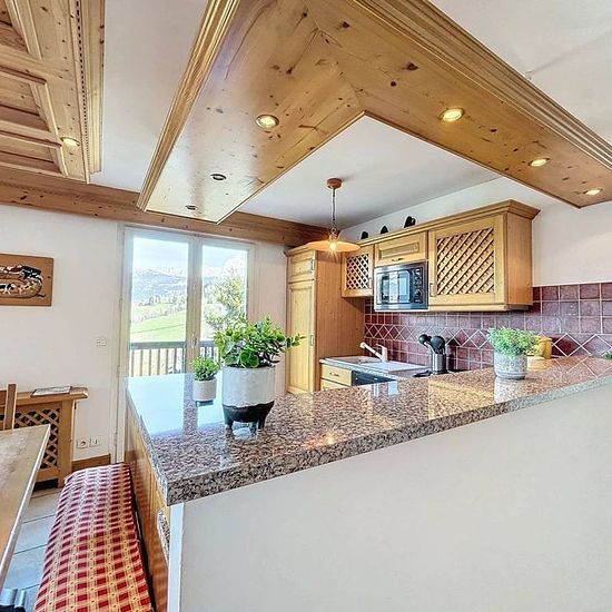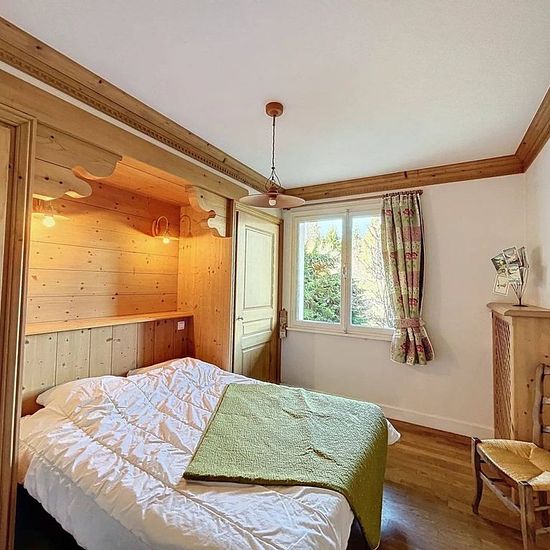 Chalet avec vue Mont Blanc composé d'une entrée, un garage avec machine à laver, une chaufferie. Au premier étage, une cuisine ouverte tout équipé (four, lave vaisselle, micro-onde, frigo, 3 feux gaz + 1 électrique, cafetière filtre, bouilloire, grille pain), un balcon vue Mont Blanc, séjour, une chambre avec lit de 140 et placard, une salle de bain, une chambre avec lits superposés et lit tiroir de 90 et placards, un wc. Au deuxième étage, une chambre avec deux lits de 90, une chambre en enfilade avec un lit de 90, une autre chambre avec li...