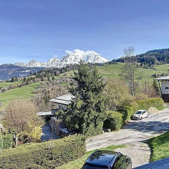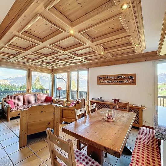 Chalet avec vue Mont Blanc composé d'une entrée, un garage avec machine à laver, une chaufferie. Au premier étage, une cuisine ouverte tout équipé (four, lave vaisselle, micro-onde, frigo, 3 feux gaz + 1 électrique, cafetière filtre, bouilloire, grille pain), un balcon vue Mont Blanc, séjour, une chambre avec lit de 140 et placard, une salle de bain, une chambre avec lits superposés et lit tiroir de 90 et placards, un wc. Au deuxième étage, une chambre avec deux lits de 90, une chambre en enfilade avec un lit de 90, une autre chambre avec li...