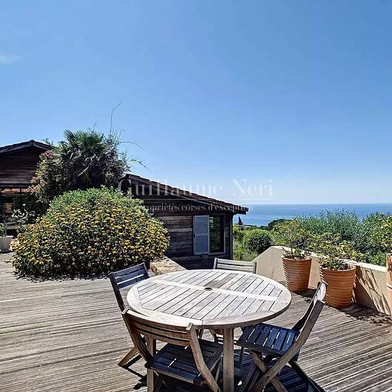 Située à Aqua Doria, cette charmante villa en bois avec sa dépendance vous offre une vue panoramique imprenable. Nichée au cœur d’une végétation méditerranéenne aux senteurs corses, elle se trouve à proximité de la plage. La villa principale dispose de 3 chambres, dont une à l'étage principal avec sa salle de bain et 2 chambres au rez-de chaussé, avec salle de bain commune et accès indépendant par l'extérieur. La dépendance de 50 m² comprend 2 chambres supplémentaires ainsi qu'une salle de douche. Une magnifique piscine avec terrasse complèt...