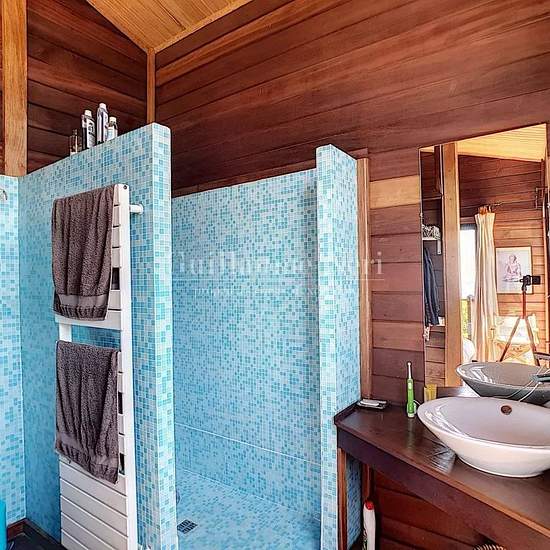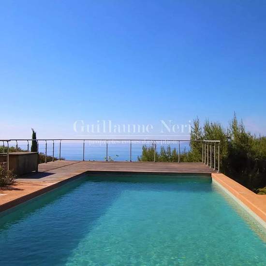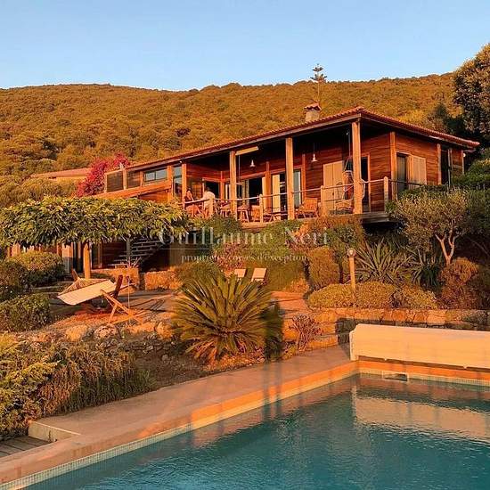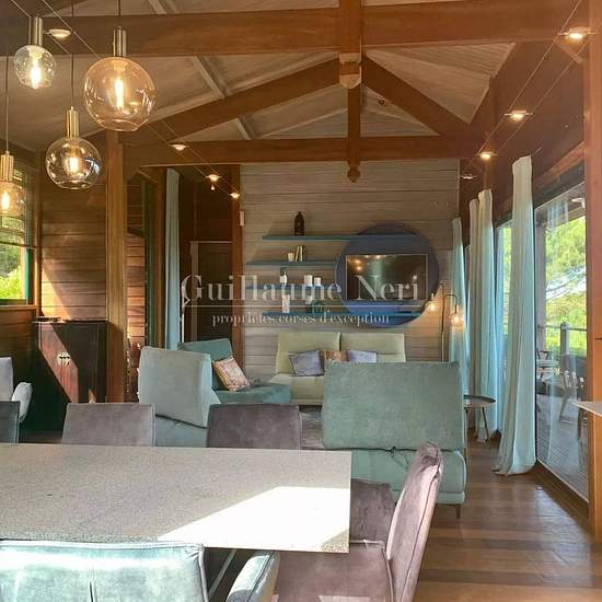 Située à Aqua Doria, cette charmante villa en bois avec sa dépendance vous offre une vue panoramique imprenable. Nichée au cœur d’une végétation méditerranéenne aux senteurs corses, elle se trouve à proximité de la plage. La villa principale dispose de 3 chambres, dont une à l'étage principal avec sa salle de bain et 2 chambres au rez-de chaussé, avec salle de bain commune et accès indépendant par l'extérieur. La dépendance de 50 m² comprend 2 chambres supplémentaires ainsi qu'une salle de douche. Une magnifique piscine avec terrasse complèt...