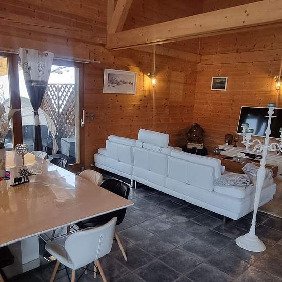 Chalet individuel de 140 m² avec 8 couchages, situé sur les hauteurs du village de Jougne dans la station de Métabief, à 5 minutes de la frontière suisse, à proximité des pistes de randonnée, VTT, ski nordique et du domaine skiable de Métabief versant Piquemiette. Secteur résidentiel et calme avec vue sur l'Aiguillon et le Suchet. Le chalet comprend au sous-sol une entrée, une buanderie, un garage. Accès premier étage par un esclaier. Grand salon cathédrale avec mezzanine coin salon avec cheminée à bois foyer fermé, cuisine ouverte entièreme...