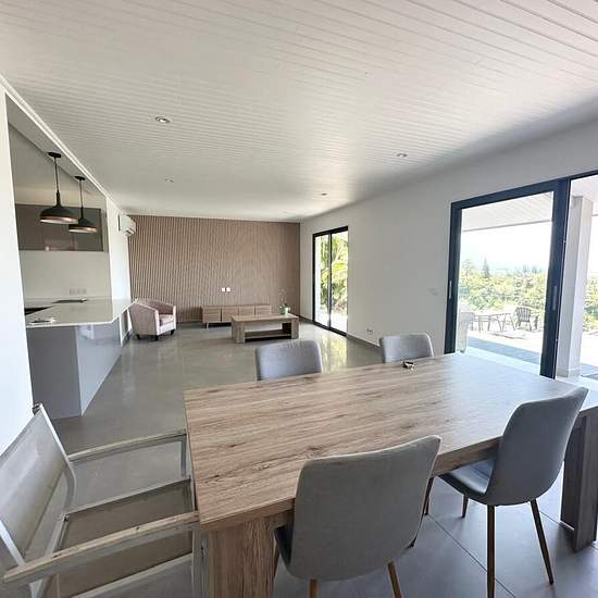 Local Immo vous propose cette magnifique villa neuf de type F6, un véritable cocon familial niché dans un environnement verdoyant, calme et paisible, offrant une splendide vue sur mer. Elle se compose de : Un grand séjour lumineux, espace convivial et accueillant. Une cuisine américaine aménagée et neuve, alliant modernité et praticité. Cinq chambres climatisées avec placards, dont une suite parentale avec salle d’eau et WC privatifs. Un vaste deck de 60 m² agrémenté d’un spa de nage de 6 mètres, idéal pour vos moments de détente. Une buande...