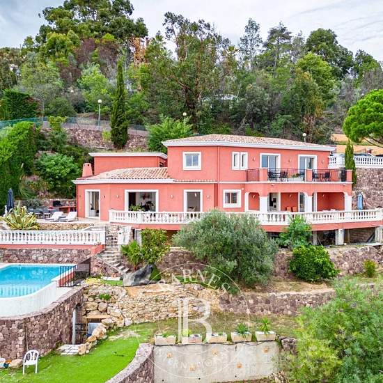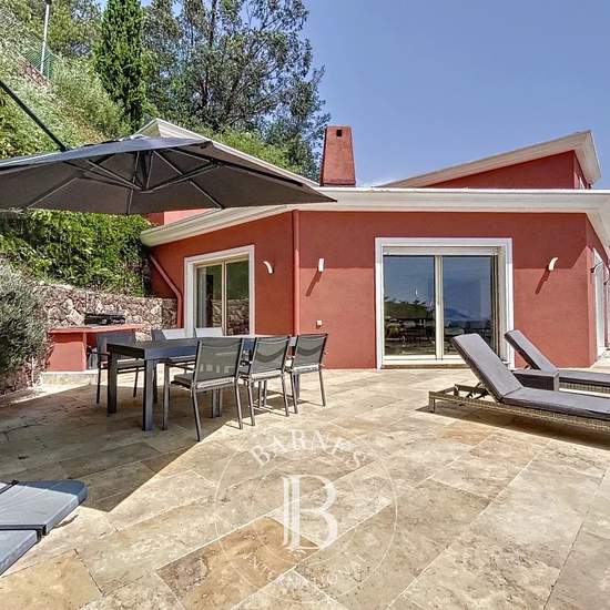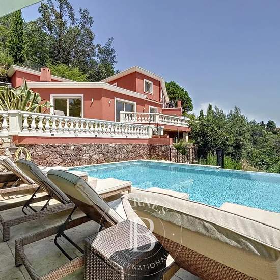 Mandelieu-la-Napoule : très belle villa à la vue mer panoramique. Située dans un quartier calme à seulement 10 minutes des plages et du port de Mandelieu-la-Napoule, à 5 minutes des commerces et de l'autoroute, spacieuse villa avec piscine profitant d'une vue dégagée sur la mer, du Cap d'Antibes à la Pointe de l'Aiguille. Villa néo-provençale de 250m² sur 2 niveaux. Elle se compose d'un lumineux double séjour d'environ 100m² avec un coin bureau, s'ouvrant sur une grande terrasse partiellement couverte comportant un salon et 2 tables à manger...