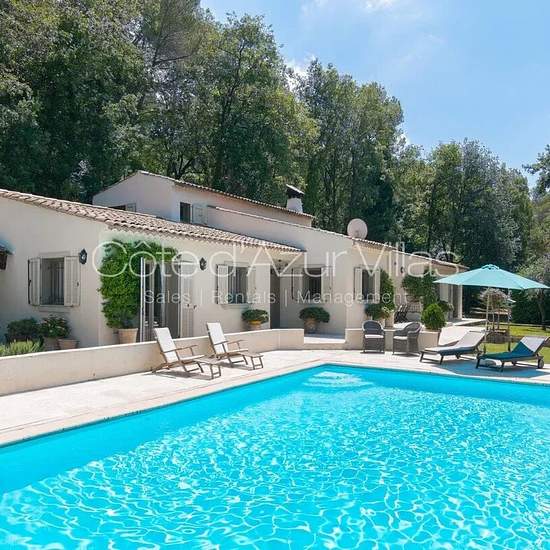 INDISPONIBLE Villa des Merles Loyer tout compris. Villa de 4 chambres située sur une colline boisée au calme au dessus de Mouans Sartoux, exposée ouest avec grande piscine, terrasses, jardin, abri voiture. Elle se compose de : Au rez-de-chaussée: hall d'entrée avec toilettes invités, grande cuisine américaine entièrement équipée avec séjour en open space. Fenêtres coulissantes ouvrant sur la terrasse. Chambre de maître avec hauts plafonds et portes-fenêtres ouvrant sur la terrasse et sa salle d’eau en suite avec douche à l'italienne. Chambre...