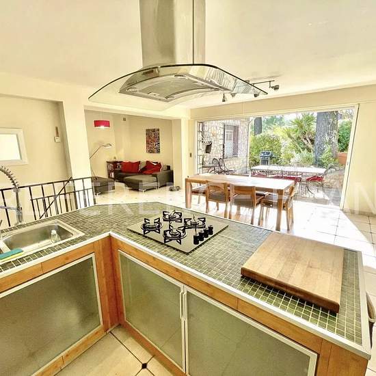 Située dans un domaine privé à proximité des écoles internationales et du Golf club de Mougins. Charmante propriété au calme absolu d'une surface de 255 m2, entièrement climatisée et équipée du chauffage au sol. Elle est composée ainsi : NIVEAUX 1 : - Entrée - Double réception - Séjour/salon TV - Salle à manger - Cuisine américaine équipée avec arrière cuisine - Buanderie - Chambre 1 : Master en suite de 40 m2 avec dressing, salle de bain et salle de douche - Chambre 2 : avec bureau, penderie et salle de douche indépendante NIVEAUX 2 : - Sej...