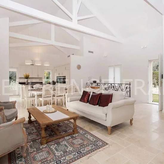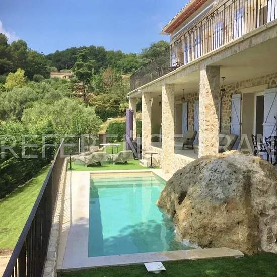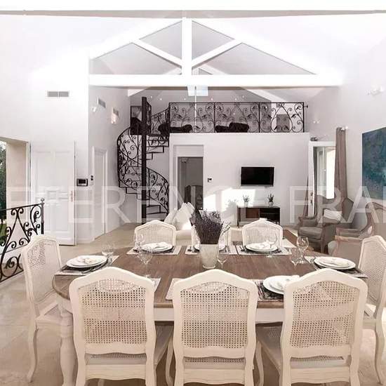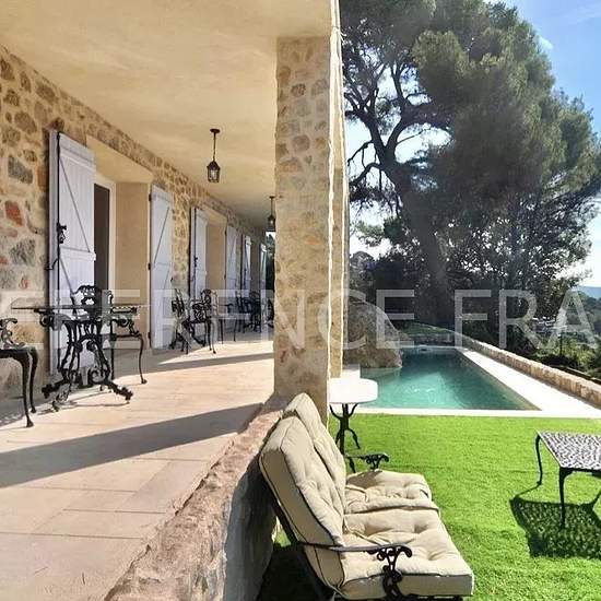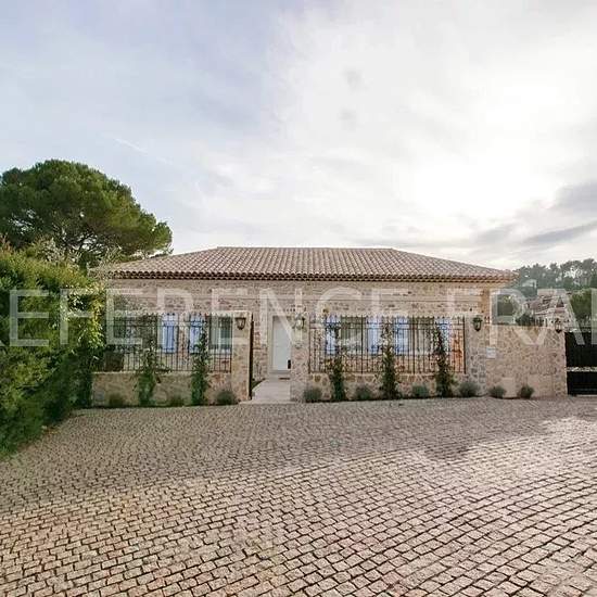 Située au calme dans un domaine privé à 5 minutes du vieux village de Mougins. Belle villa provençale récemment rénovée avec des prestations modernes et confortables d’une surface de 220 m2 édifiée sur 1 000 m2 de terrain avec piscine bénéficiant d'un bel aperçu mer. Entièrement climatisée et doté d’un système de chauffage au sol, elle se compose ainsi : NIVEAU 1 : - Une entrée avec toilette invité - Un séjour/salon TV - Une salle à manger - Une cuisine entièrement équipée avec arrière cuisine - Un bureau en mezzanine - Chambre 1 : Suite par...