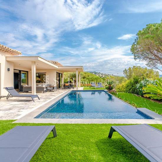 Location saisonnière à Sainte-Maxime. Magnifique villa contemporaine proche des plages de la Nartelle avec des prestations luxueuses. Elle offre : Entrée, wc invités et vestiaire, vaste séjour cheminée, cuisine us équipée, chambre froide, 5 suites avec salle d'eau, dressing et wc. Piscine à débordement et pool house. Buanderie, grand garage. Hammam et cave à vins. Tarifs de location 2025 : - du 1er janvier au 30 avril : 3500€/ la semaine - mai : 4200€/ la semaine - Juin : 6930€/ la semaine - juillet et août : 9450€/ la semaine - septembre : ...