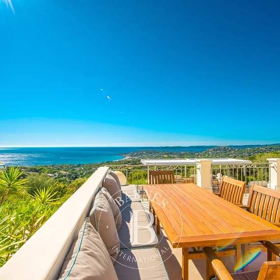 Située dans un domaine calme et sécurisé, proche des plages et du centre-ville de Sainte-Maxime, cette propriété de 350 m² offre une vue mer panoramique sur l'ensemble du Golfe de Saint-Tropez. La propriété se compose : D'une villa principale avec une cuisine équipée, une salle à manger spacieuse, un séjour offrant une vue mer et un accès aux terrasses ainsi que 4 chambres en suite avec chacune sa salle de bains. Un appartement avec une cuisine équipée, une chambre, une salle de bains ainsi qu'une agréable terrasse. Un appartement de service...