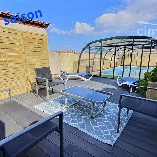 LOCATION SAISONNIERE Venez séjourner dans cette villa avec piscine privé et sécurisé. Idéale pour 8 personnes, cette villa est située sur la commune de Vendres qui se situe a 10minutes de Béziers, et de la plage. La villa est composée comme suit : Au rez de chaussée, deux chambres avec lits doubles (140), une cuisine totalement aménagée et équipée, une salle d’eau, un WC séparé et un séjour/ salle à manger. À l’étage deux chambres avec lits doubles (140 et 160). Le logement dispose également d’une terrasse, avec piscine couverte et sécurisée...