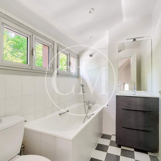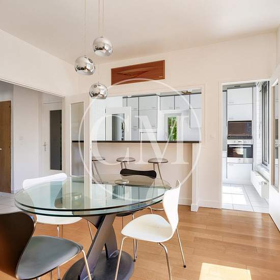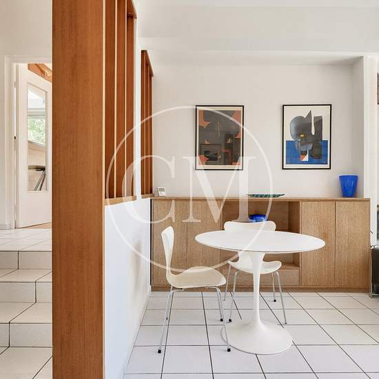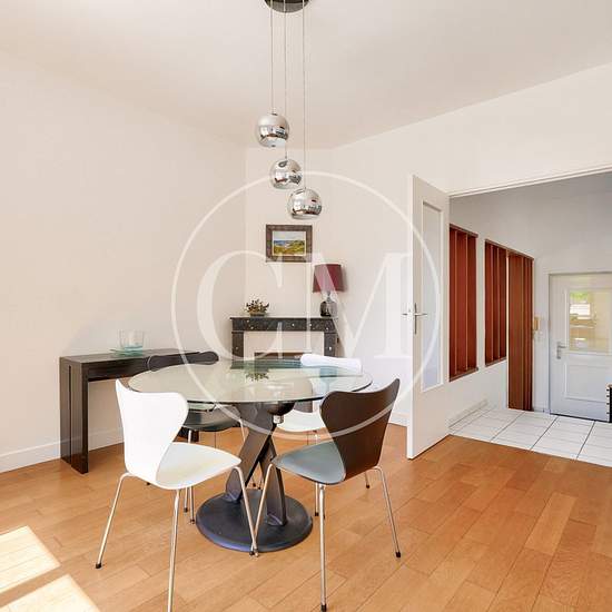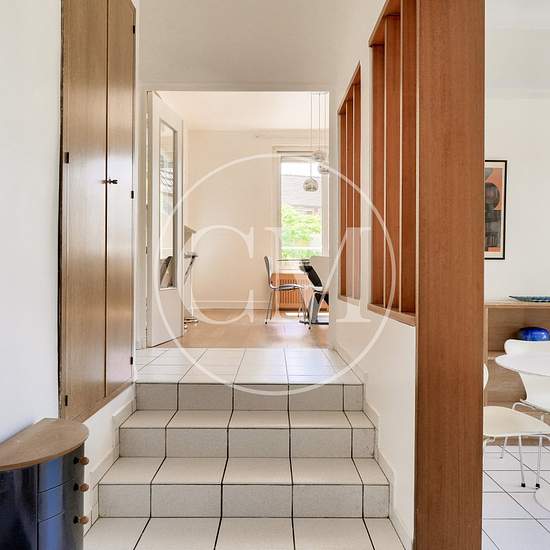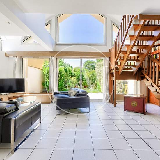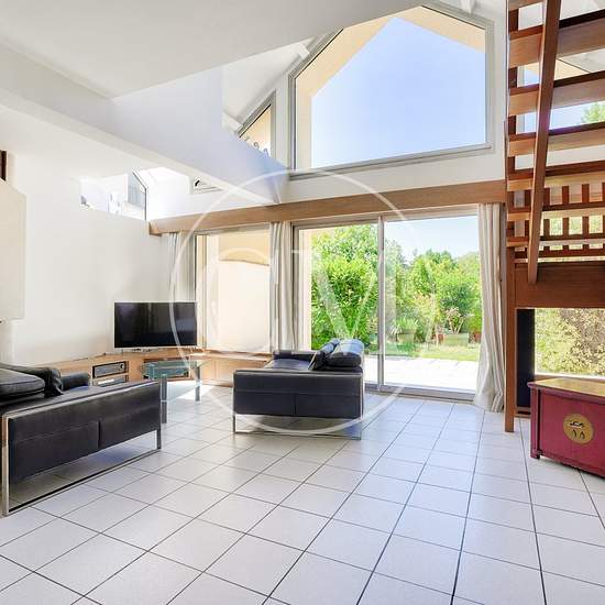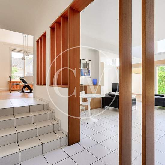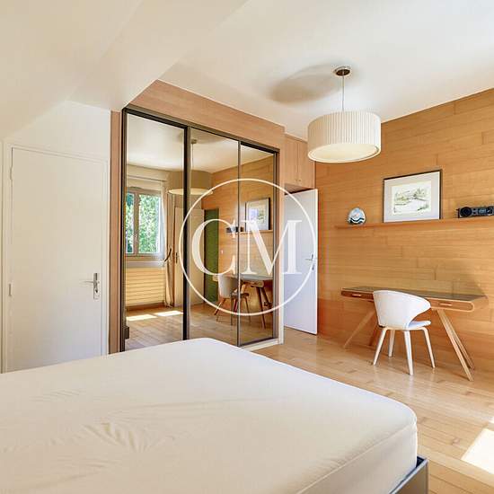 Le Cabinet Mansart vous propose : VERSAILLES PORCHEFONTAINE Maison d'architecte Charme et volume pour cette maison composée : entrée, vaste salon, salle à manger, cuisine, buanderie, wc réception A l'étage sur différents niveaux 3 chambres, 2 salle d'eau, salle de bains, et bureau En sous-sol : Laverie, cave, salle de billards, cave Jardin terrasse et parking Le tout au calme et lumineux Location meublé