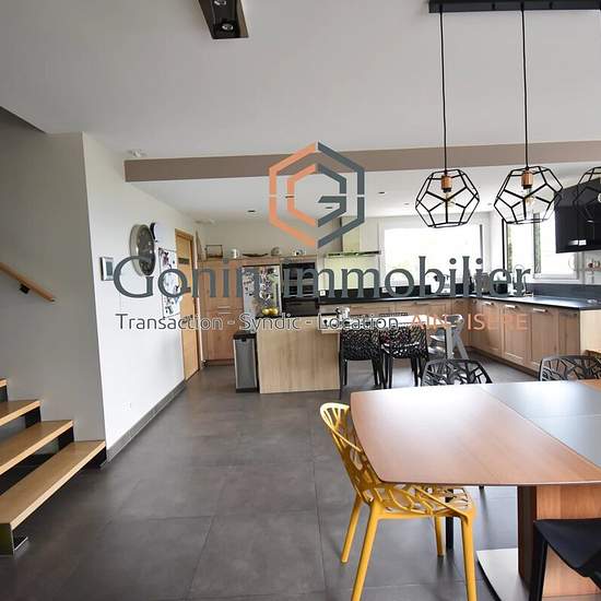 Mollon – Magnifique villa récente de standing avec panorama dégagé d’exception, à louer meublée: Elle se compose,: -Au rez-de-chaussée: d’un vaste hall d’entrée, de 3 chambres avec placards, d’une buanderie, d’une salle de bains et d’un WC. -En contrebas du hall, une grande pièce de vie de 53 m², baignée de lumière accueille, un séjour et une cuisine entièrement équipée, prolongée par un cellier. Au 1er étage, une mezzanine spacieuse dessert une 4ème chambre avec salle de bains et WC. Un garage vient compléter ce bien. Le terrain arboré est ...