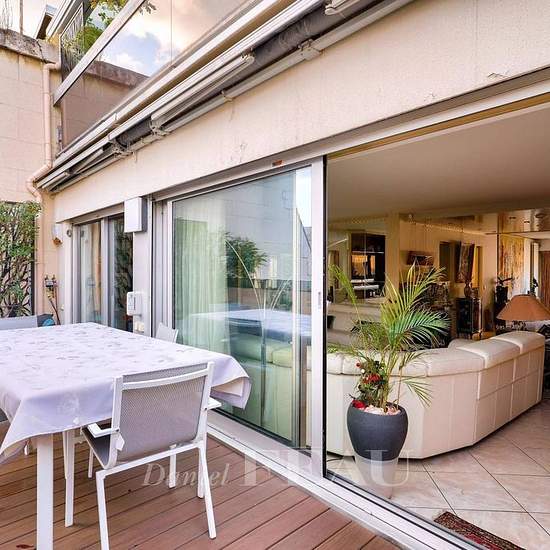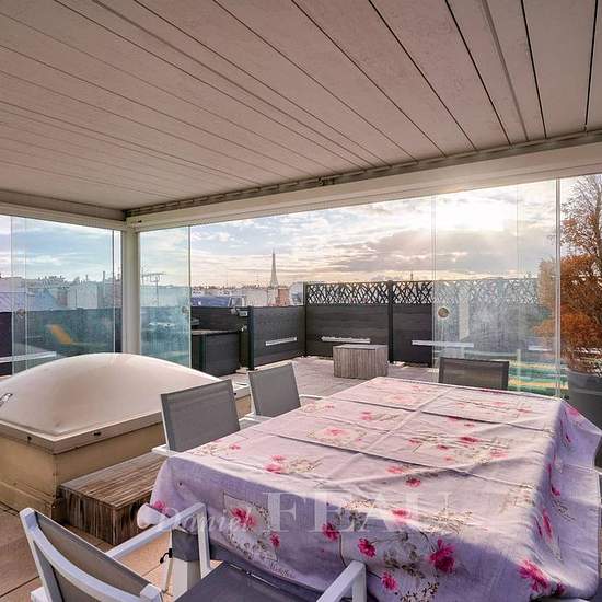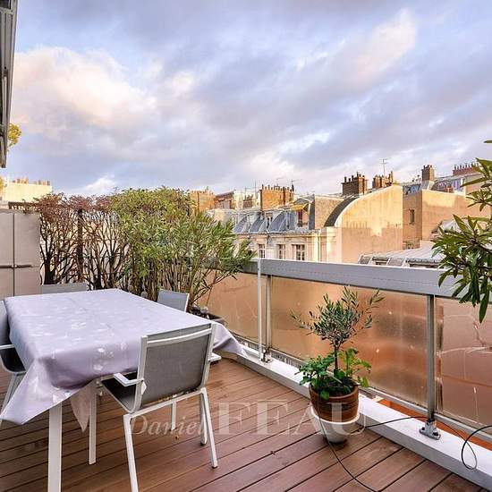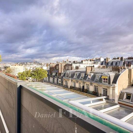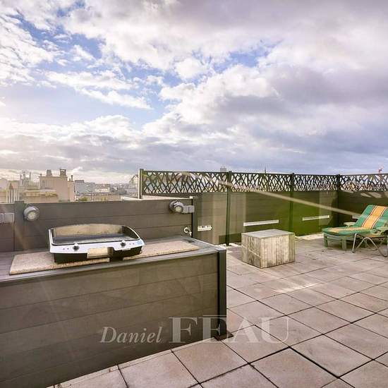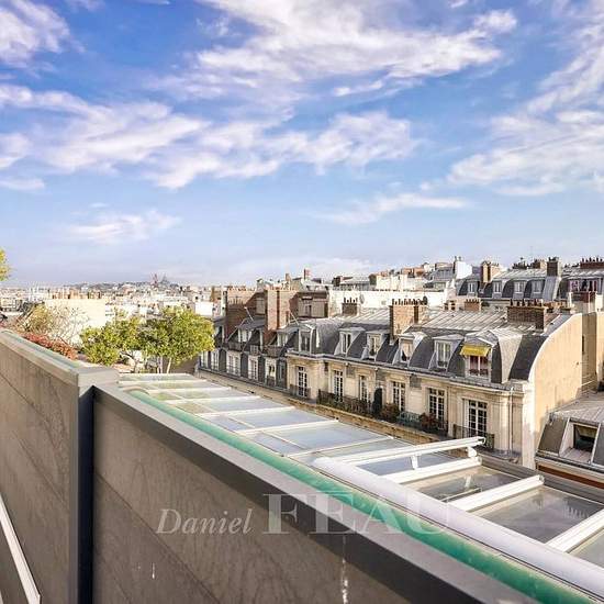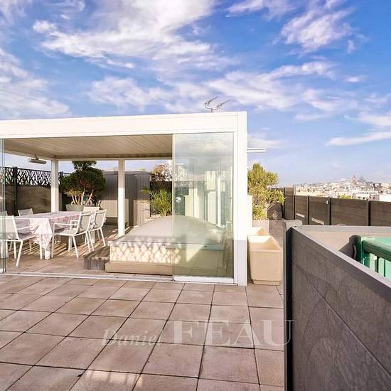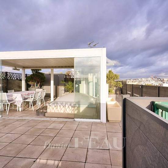 A deux pas du parc Monceau, dans une rue calme, aux derniers étages d'un immeuble semi-récent avec gardien, bel appartement loué VIDE avec toit terrasse et vues panoramiques. Au premier niveau (7ème étage), il se compose d'une entrée avec placards, d'un très grand séjour/salle à manger de plus de 60m2 donnant sur une terrasse 17m2 exposée sud, d'une grande cuisine équipée et de toilettes séparées. Un ascenseur privatif (ou escalier intérieur) permet d'accéder à l'étage supérieur qui dessert une première chambre ouvrant sur une large véranda/...