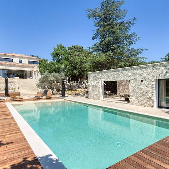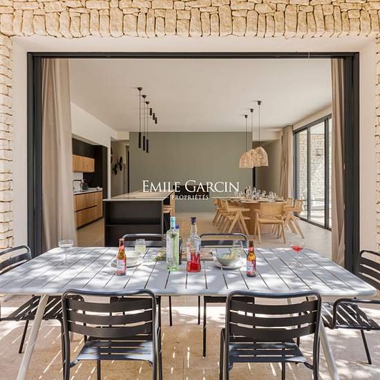 Idéalement située à Cabrières d'Avignon, au coeur du triangle d'or du Luberon, cette élégante propriété offre un cadre de villégiature raffiné entre nature et confort contemporain. La maison dispose de 6 chambres spacieuses et lumineuses avec leurs salles de bains privatives, complétées par un studio indépendant au bord de la piscine et un espace de jeux/bureaux. Elle peut accueillir jusqu'à 14 personnes, enfants inclus, dans un confort absolu. Les intérieurs sont lumineux et climatisés, dotés d'un mobilier élégant et d'une literie haut de g...