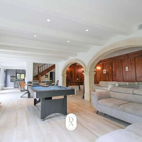 La PROVENCALE est une belle maison traditionnelle de 380m2 sur un magnifique terrain arboré de 8300m2. Dès que vous franchissez le portail, vous serez émerveillés par la quiétude du lieu. Des arbres centenaires entourent le terrain de tennis et la belle piscine de 12mX6. Sans aucun vis à vis, la maison, tournée vers les collines est entourée de verdure. Une grande pièce à vivre très lumineuse avec cheminée en pierre donne sur une terrasse pour vos repas, comme la cuisine, dans son prolongement. 7 chambres avec salles de bains la complètent. ...