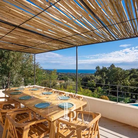Cette villa récemment rénovée d'environ 300m², se situe sur les hauteurs de La Croix-Valmer et offre une vue sur la mer. Au rez-de-chaussée, la villa se compose d'une cuisine ouverte sur le salon et la salle à manger, de deux chambres en suite. Un espace bureau/bibliothèque ainsi qu'une chambre en suite avec une terrasse tropézienne complètent le premier niveau. Au rez-de-jardin, se trouvent une suite parentale, deux chambres en suite et un salon TV. Le jardin, joliment arboré, dispose de plusieurs terrasses, d'une piscine ainsi que d'un ter...
