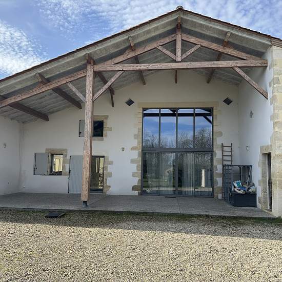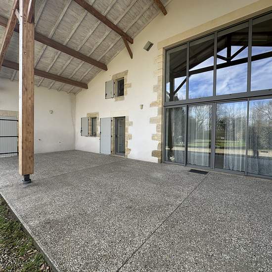 1H de Bordeaux, proche sortie d'autoroute MARMANDE, en campagne, MAGNIFIQUE CORPS DE FERME entièrement rénové AVEC BEAUCOUP DE GOÛT, sur 2 niveaux offrant 290m2 de confort et de modernité. Au RDC : l'arrivée se fait sur une terrasse couverte de 55m2, une entrée, en suivant une cuisine-coin repas 48.65m2 ouvrant sur une grande terrasse au sud, salon cheminée insert 44m2 avec mezzanine 32m2, 3 chambres dont 1 suite parentale(salle d'eau + wc) , une salle de bain, un wc, un cellier attenant à la cuisine, une chaufferie, une terrasse couverte (p...