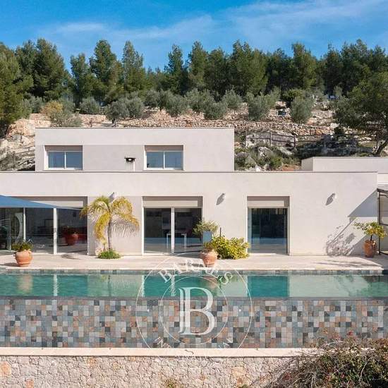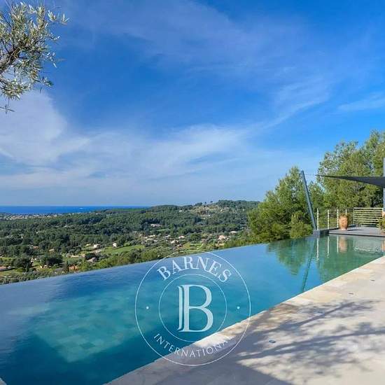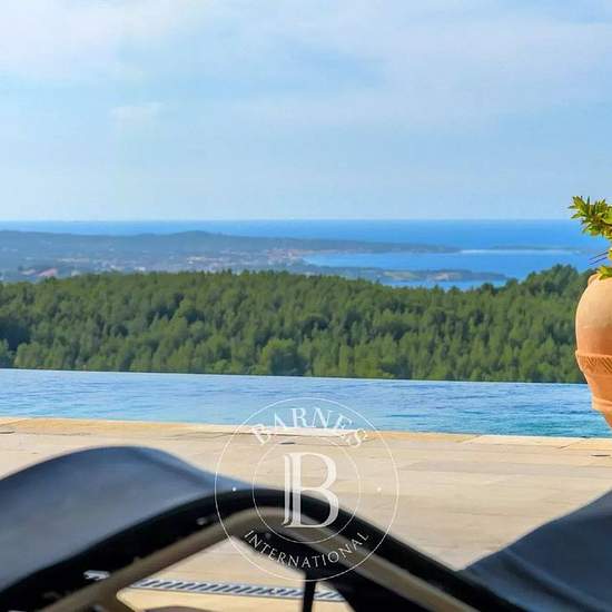 Implantée en position dominante, cette superbe propriété contemporaine bénéficie d’une vue panoramique exceptionnelle sur la mer et la campagne environnante. La villa offre de très beaux volumes et une luminosité remarquable. Le vaste salon-séjour, largement ouvert sur l’extérieur, se prolonge par une grande terrasse et une piscine à débordement de 15 x 4 mètres. La cuisine ouverte, parfaitement intégrée à l’espace de vie, invite à des moments de convivialité. L’espace nuit principal se compose d’une suite parentale avec salle de bains, deux...
