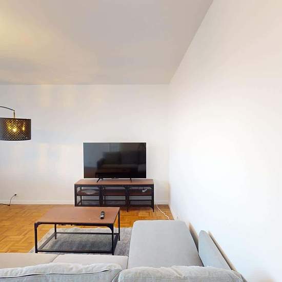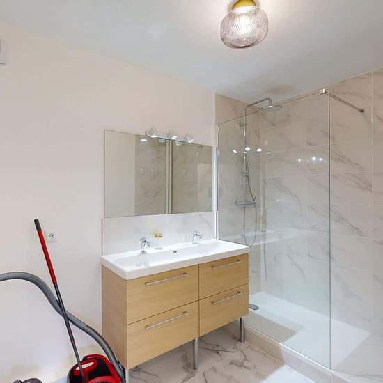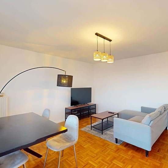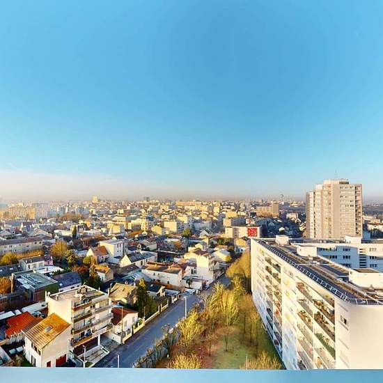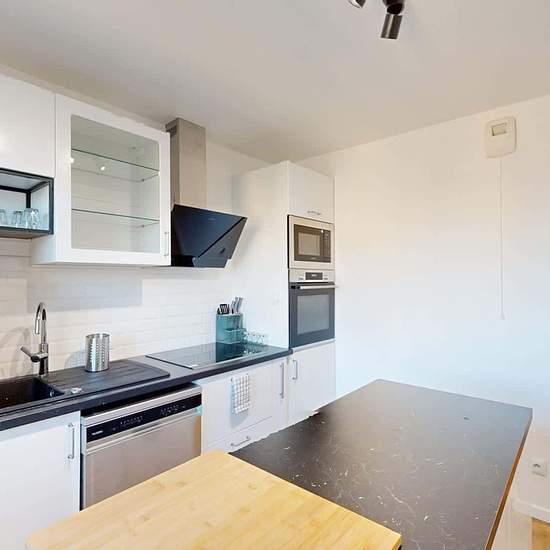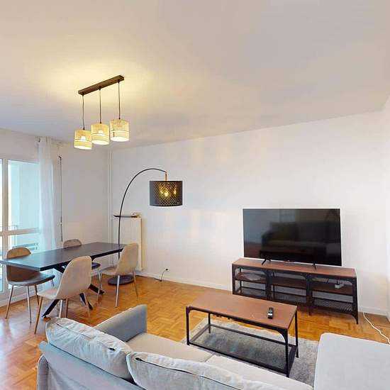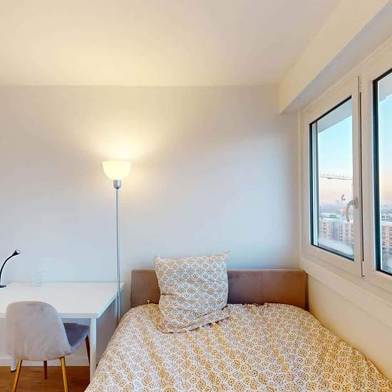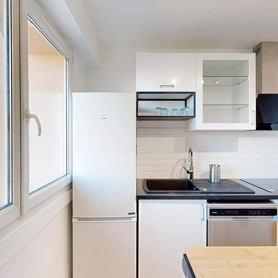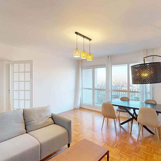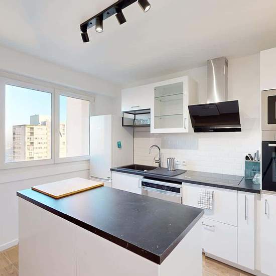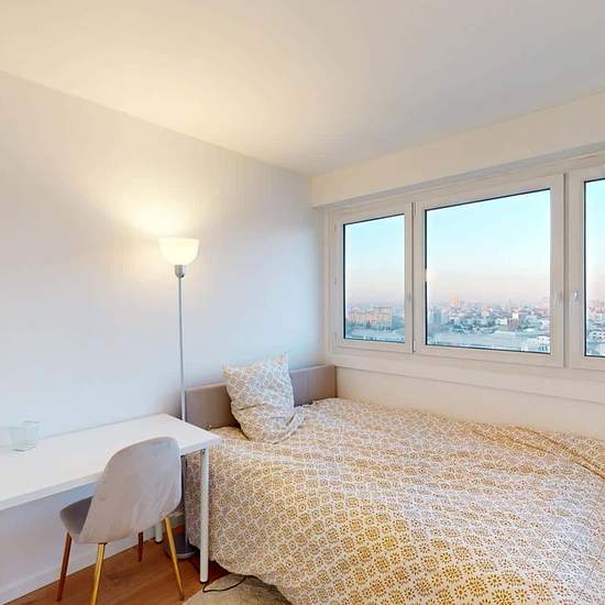 Oqoro presents this 4-bedroom shared apartment of 96 m² at 1 rue Newton in Rosny-sous-Bois. THE COMMON AREAS The living room is furnished with a corner sofa, coffee table, TV and TV stand, as well as a dining table for 4 people. It opens onto a balcony offering an incredible, unobstructed view (from the 15th floor!). The separate kitchen is equipped with a built-in oven and microwave, a cooktop, an extractor hood, a sink, a refrigerator with freezer compartment, a dishwasher, and plenty of storage and kitchen utensils. An added bonus: a cen...