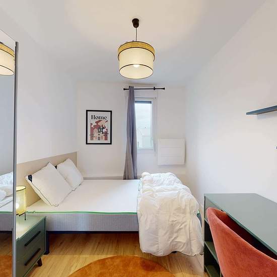 This spacious and comfortable room has been designed for you dear roomie! Practical and functional, the room is equipped with high quality bedding (140x200cm), a beautiful wardrobe, a night table and a true office space for your exams or your home office days! All of this in a cheerful and warm atmosphere. In addition, you have access to a shared bathroom and a shared balcony. Beautiful flatshare in Saint-Denis ! Discover Saint-Denis Jardin Fatima, our cosy and freshly renovated contemporary-style apartment. Close to local shops and restaura...