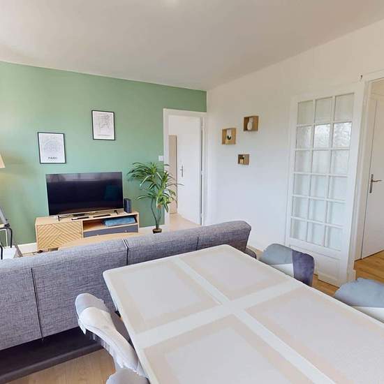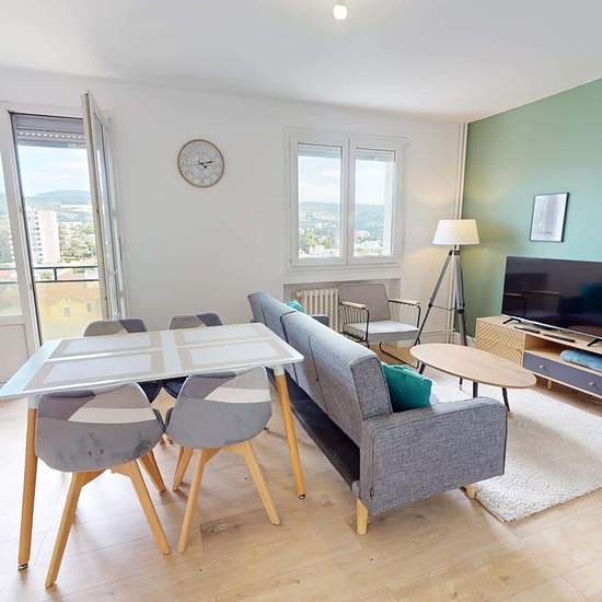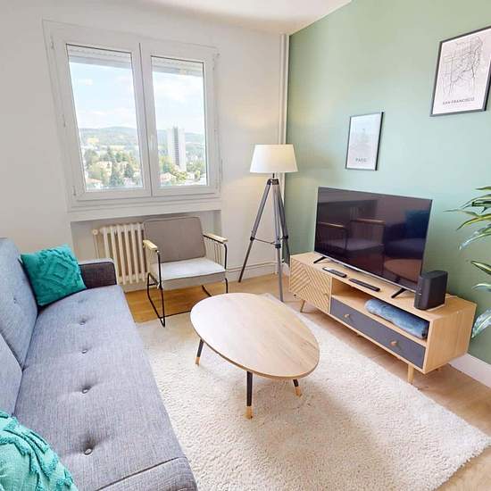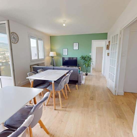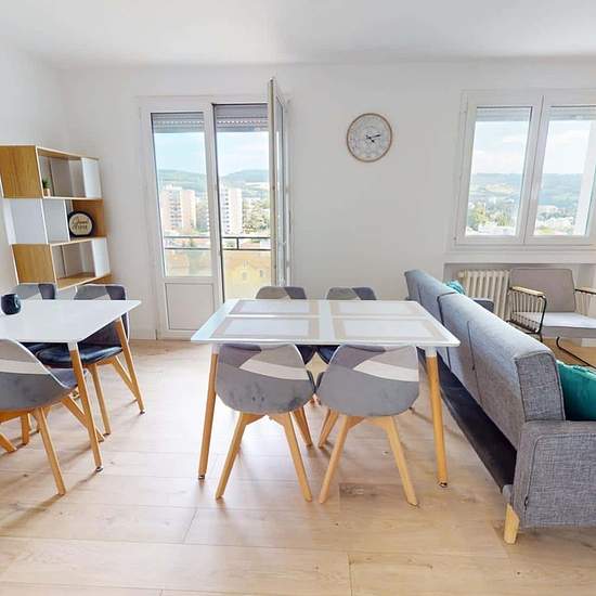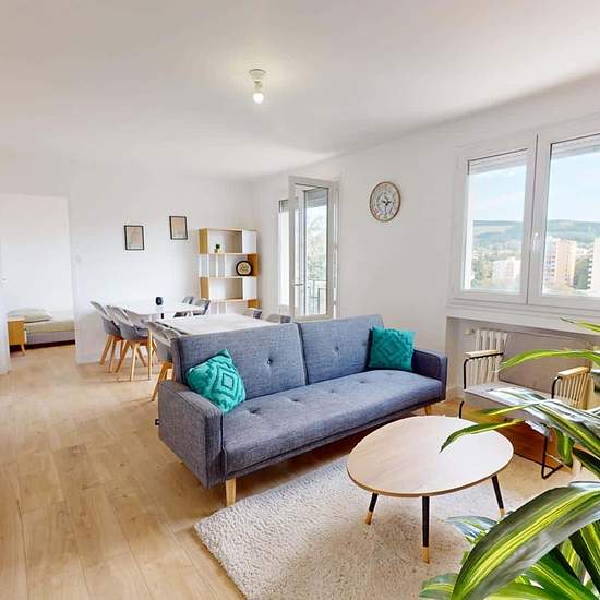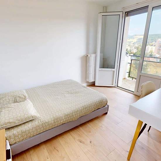 APPARTEMENT 5 PIÈCES AVEC BALCON Nous sommes ravis de vous présenter cette colocation de 4 chambres de 87 m² au 5 Rue Docteur Maurice Thiollier à Saint-Étienne (42100). LA CHAMBRE Cette chambre est équipée d'un lit double, d'un bureau avec sa chaise, d'une grande armoire et d'une table de nuit. Cette pièce est particulièrement lumineuse grâce à une porte-fenêtre qui donne sur un balcon. LES ESPACES COMMUNS Un vaste salon vous attend, parfaitement aménagé avec un canapé, une table basse, un meuble TV avec télévision, un fauteuil, deux table...