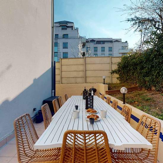 Discover this beautiful room fully equipped and designed for one person. You will also have the great pleasure of sharing your bathroom with one of your colivers. Get to know more about your neighbour while brushing your teeth! What could be better than enjoying a garden in the middle of the vineyards with a view over Paris? This modern house, inspired by Greek architecture with its blue shutters, will seduce you with its location and its many common spaces. You will discover a charming house transformed into a coliving surrounded by its fru...