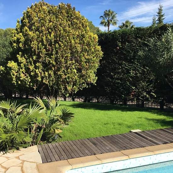 Ideally situated in the gated estate of La Peyrière between Mougins School and the golf course, a large and luxurious 318 m² villa of living space is available for long-term furnished rental. It comprises 9 rooms, including 6 beautiful bedrooms, one large living room plus one large dining room, one office and three bathrooms/shower rooms, as well as a large kitchen. Spread over 3 levels (first floor, ground floor, garden level) it offers a splendid panoramic view over the countryside. Outside there is a lovely Provençal garden of more than 1...
