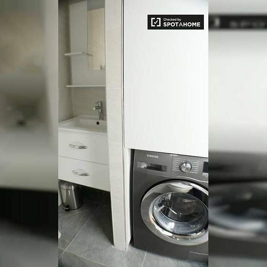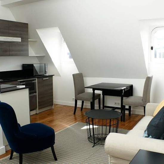 A gorgeous studio apartment with a loft bedroom is available to rent nearby the iconic Arc de Triomphe in Paris's 16th arrondissement. The apartment has a stylish living room, where you can relax on the sofa and watch TV, or sit down to a delicious meal at the dining table. The kitchen has it all, including an oven, a stove, a dishwasher, and a microwave. Upstairs is the cozy loft, where you'll find a large double bed and a big built-in wardrobe. The bathroom is modern, with a sizable shower, a heated towel rack, and a washing machine. You...
