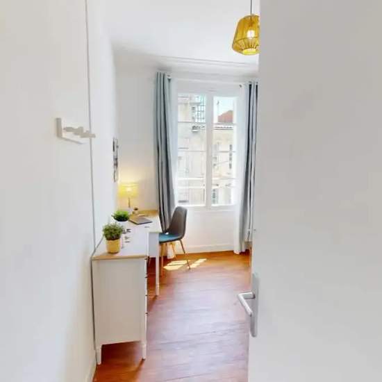 This lovely private bedroom in a fully equipped, furnished and all-inclusive flatshare in Bordeaux is a mix of comfort and design. It has got household furnishings, including a bed with pillows and duvet What is missing is your things to feel at home! The room can be locked if you need intimacy. The flatshare can be found in the Chartrons - Grand Parc neighborhood, in the heart of Bordeaux. Plenty of shops, public transports, restaurants are accessible close by. The apartment is on floor 0 without lift. It is entirely equipped and is compose...