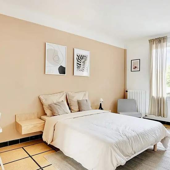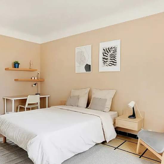 Welcome to Clamart, near Paris. This apartment is located on the 1st floor of a building and offers a living space of 116 m². The 16 m² bedroom creates a soothing atmosphere with its minimalist brown tones. Inside, you will find a comfortable double bed, a furnished desk with its matching shelf, and carefully chosen decorative elements to add a touch of charm to the space. Additionally, the apartment features a private balcony, providing a pleasant outdoor area. Your rent already includes all the essentials you need for co-living: the rental...