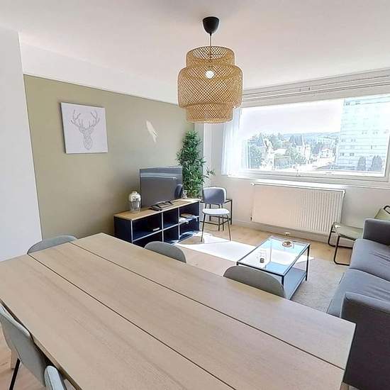 OQORO vous présente cette colocation de 5 chambres de 90,98m² au 100 Avenue du Général Leclerc. Il est situé au 3ème étage avec ascenseur d’un immeuble avec gardien. LES ESPACES COMMUNS La pièce de vie est meublée avec un canapé, une télévision, une table à manger et plusieurs chaises. C’est un espace chaleureux, idéal pour partager des moments entre colocataires. La cuisine séparée est équipée d’un four, d’un micro-ondes, de plaques de cuisson, d’une hotte, d’un évier, d’un réfrigérateur avec compartiment congélateur, d’un lave-vaisselle, ...
