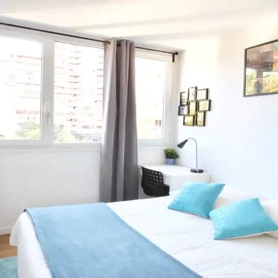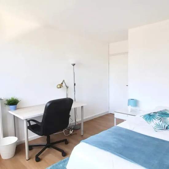 Room of 10m², fully furnished. It has a double bed (140x190) accompanied by a bedside table with lamp and a large mirror at the head of the bed. A work area is included, composed of a desk with chair and lamp. The room also has storage space: a wardrobe with hanging space and a shelf. Located in the Nanterre Préfecture district, this 90m² apartment benefits from an ideal location, just a stone's throw from the André Malraux Park and the RER station: Nanterre Préfecture and close to all amenities. The apartment is on the 6th floor of a secure...