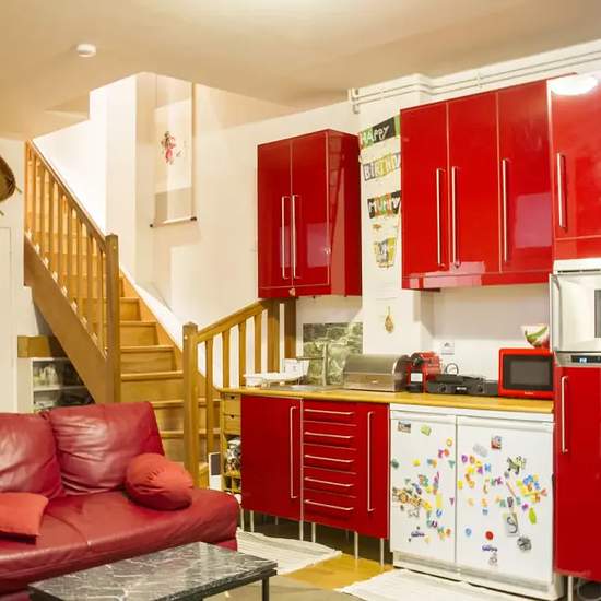 This split-level apartment on Rue Henner is on the ground floor. One of the bedrooms is occupied by the landlords. Otherwise, it’s a large and wonderful apartment. On the main floor, you’ll find a sleek and modern kitchen, a dining area, a spacious living room, and access to a garden patio. Downstairs is a more open concept, with a fully equipped kitchenette and a second living area with a sofa and TV. There is a bathroom on this floor, as well, as the bedroom that is being rented. This apartment is situated on Rue Henner, a quiet street loc...