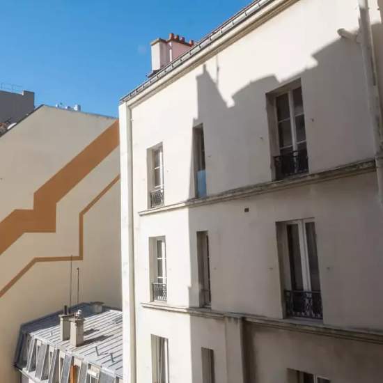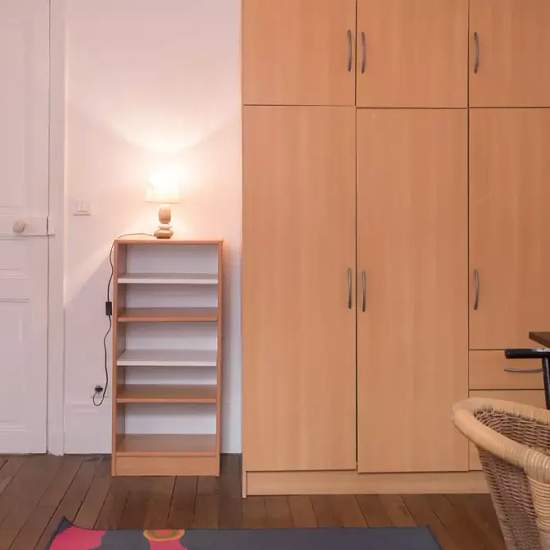 Bedroom 1 is spacious yet cosy, and has a sofa bed, a heating unit, a desk, shelving, a standalone wardrobe, and its own independent key. This 60 m², 3-bedroom apartment has spacious rooms for rent – perfect for professionals and students. The property offers that special Parisian charm, reflected in the elegant entrance and corridor of the property. The long corridor with beautiful wooden floorboards divides the apartment into bedrooms to the right and the common areas to the left There is a fully equipped kitchen with modern amenities and ...