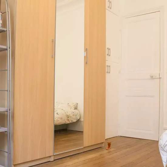 Bedroom 3 is very large and comfortable. This room has a sofa-bed, heating unit, desk, shelving, a standalone wardrobe, and its own independent key. This 60 m², 3-bedroom apartment has spacious rooms for rent – perfect for professionals and students. The property offers that special Parisian charm, reflected in the elegant entrance and corridor of the property. The long corridor with beautiful wooden floorboards divides the apartment into bedrooms to the right and the common areas to the left There is a fully equipped kitchen with modern ame...
