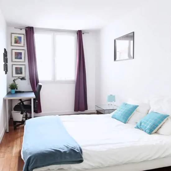14m² room, fully furnished. It has a double bed (140x190) and a bedside table with lamp. A work area is included, composed of a desk with chair and lamp. The room also has storage space: a wardrobe with hanging space and a shelf. Located in the 18th arrondissement of Paris, this 80m² flat is ideally situated, a few steps from the Sacré Coeur and the Simplon metro station and close to all amenities. The flat is located on the 2nd floor of a secure building with digicodes and caretaker, with a lift. The flat is composed of 3 rooms, a kitchen, ...